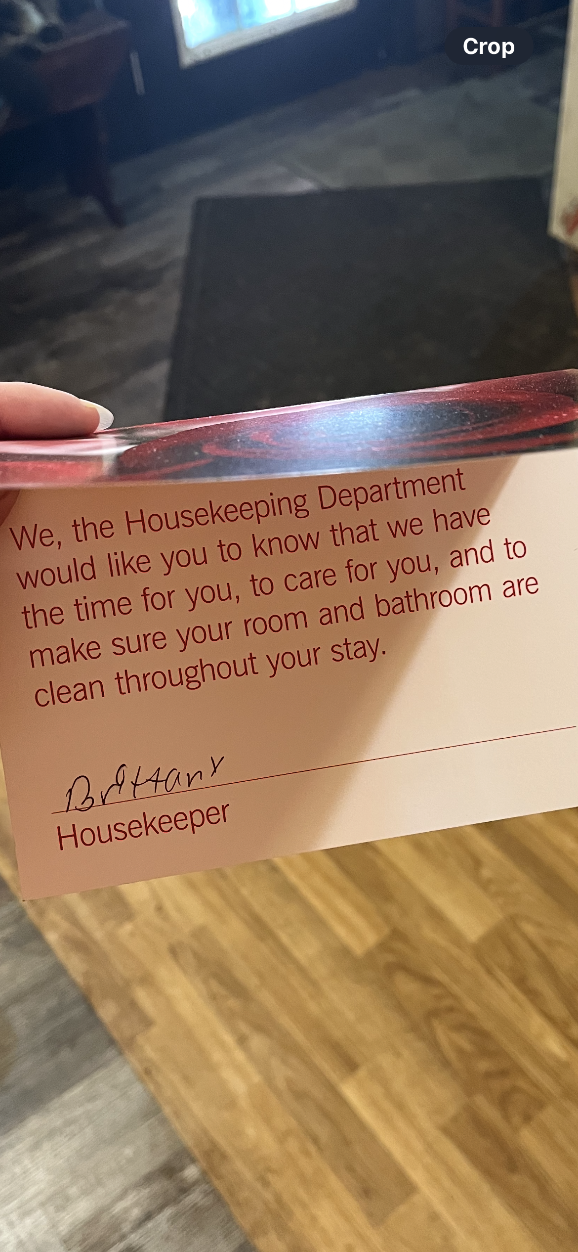 So it’s me again with yet another act of kindness from the Cleveland Clinic my husband Keith got this nice card hand delivered to his room. From his house keeper. How thoughtful of her