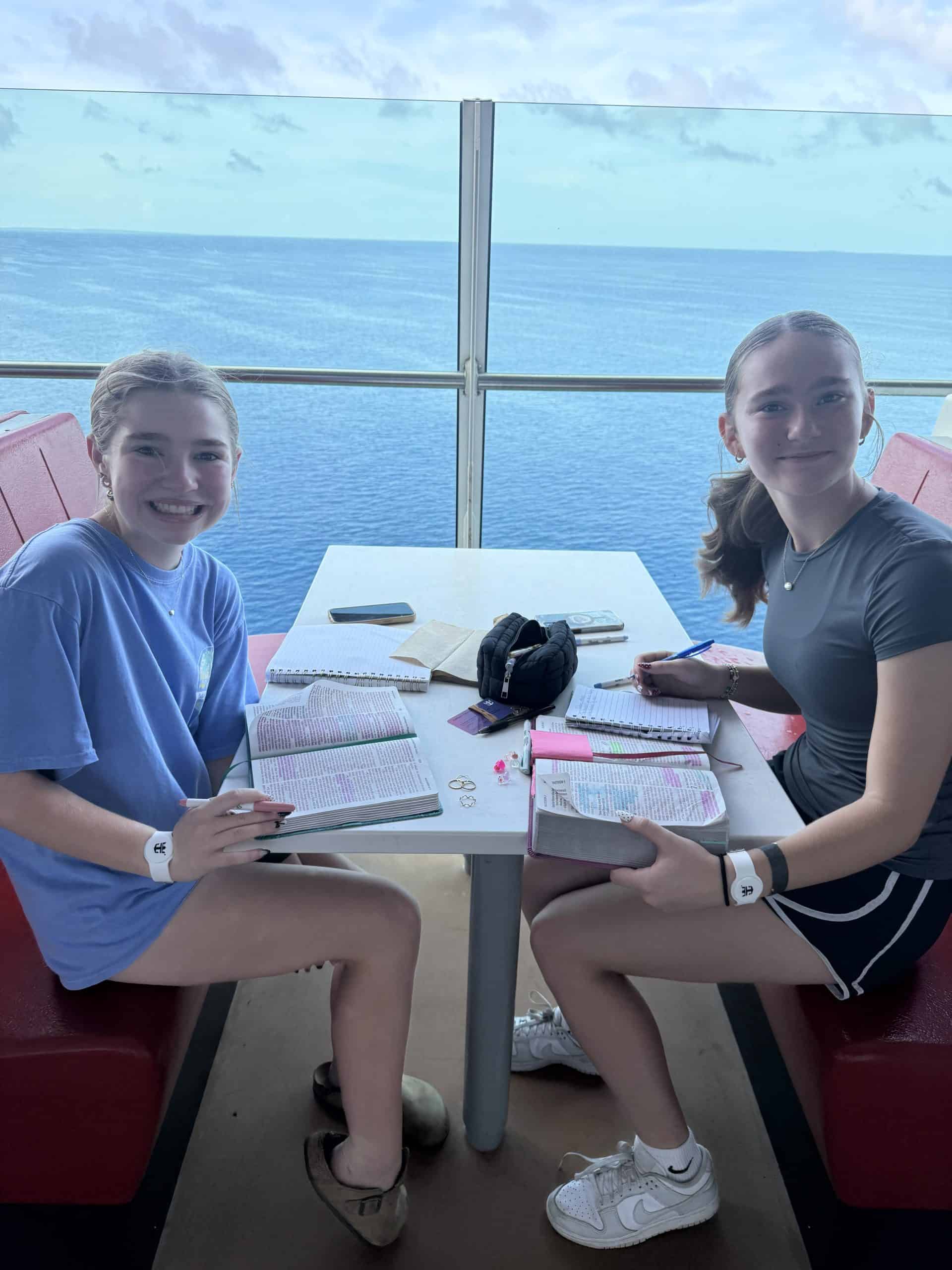 I'm not sure this is an act of kindness but an act of humanity. On a cruise in the Caribbean sea with so many fun things happening. These 2 teenage girls 12-14 were on the deck studying the Bible, highlighters an all. We chatted about Matthew 7, they said " the story is sooo good ". Enjoyable talking about the Word with these two.