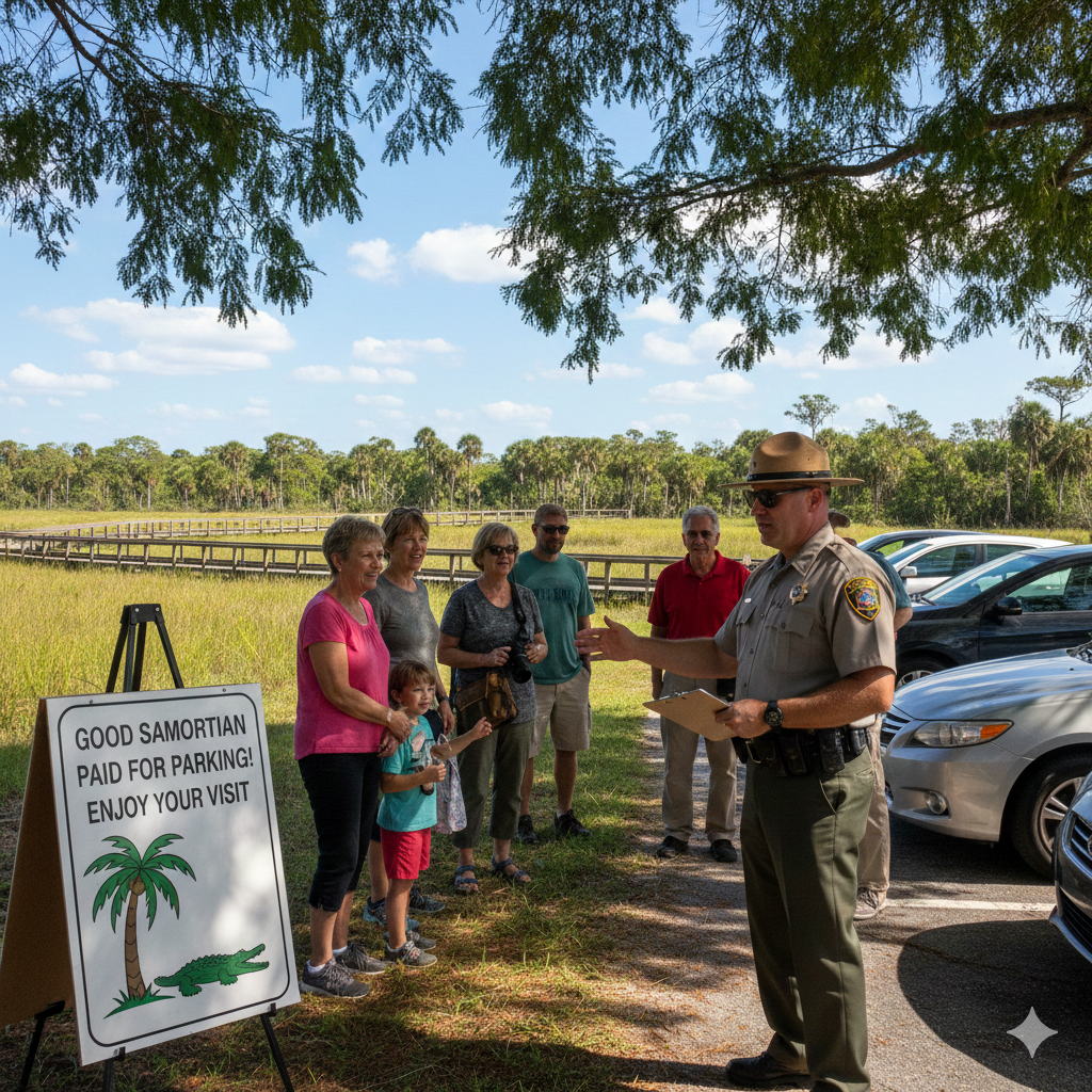 While we were in Florida, there was a national park that had a $5.00 parking fee. When we pulled in to pay, the attendant waived us in and said that we were already paid for. I inquired about how that happened and he said that a man had given him $100 to pre pay for the next 20 cars and to give them the message of "Hope you have a Great day". How kind is that ? #chilloutanddogoodstuff