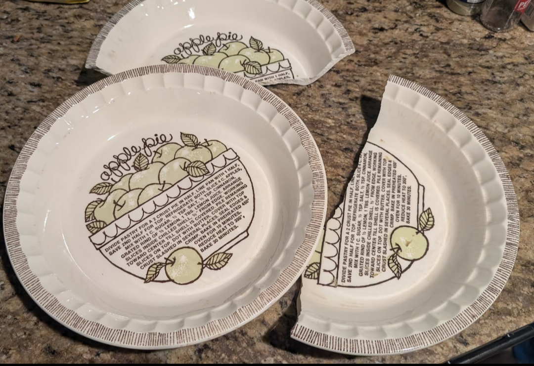 My mom sent me a picture of one of her favorite antique pie plates that suddenly broke in the oven. I immediately ordered a new one of the exact same kind on eBay and sent it to her as a surprise.