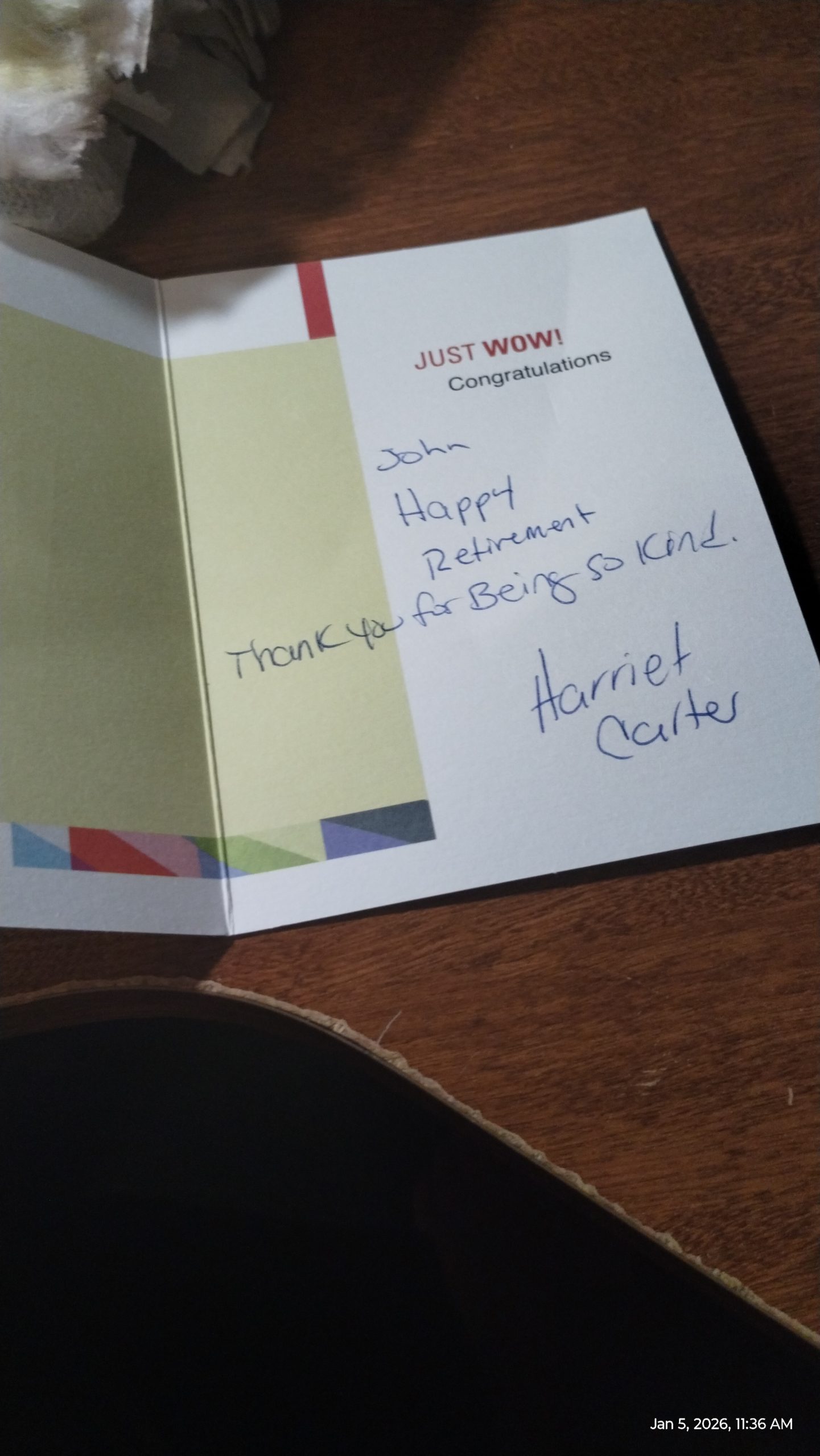 My buddy, Harriet Carter, gave me a Happy Retirement card, writing inside "Thanks for being so kind". Made my WEEK. Also, she donated $50 in my name to the local food bank ! Very nice. Thank you, Harriet 🙂